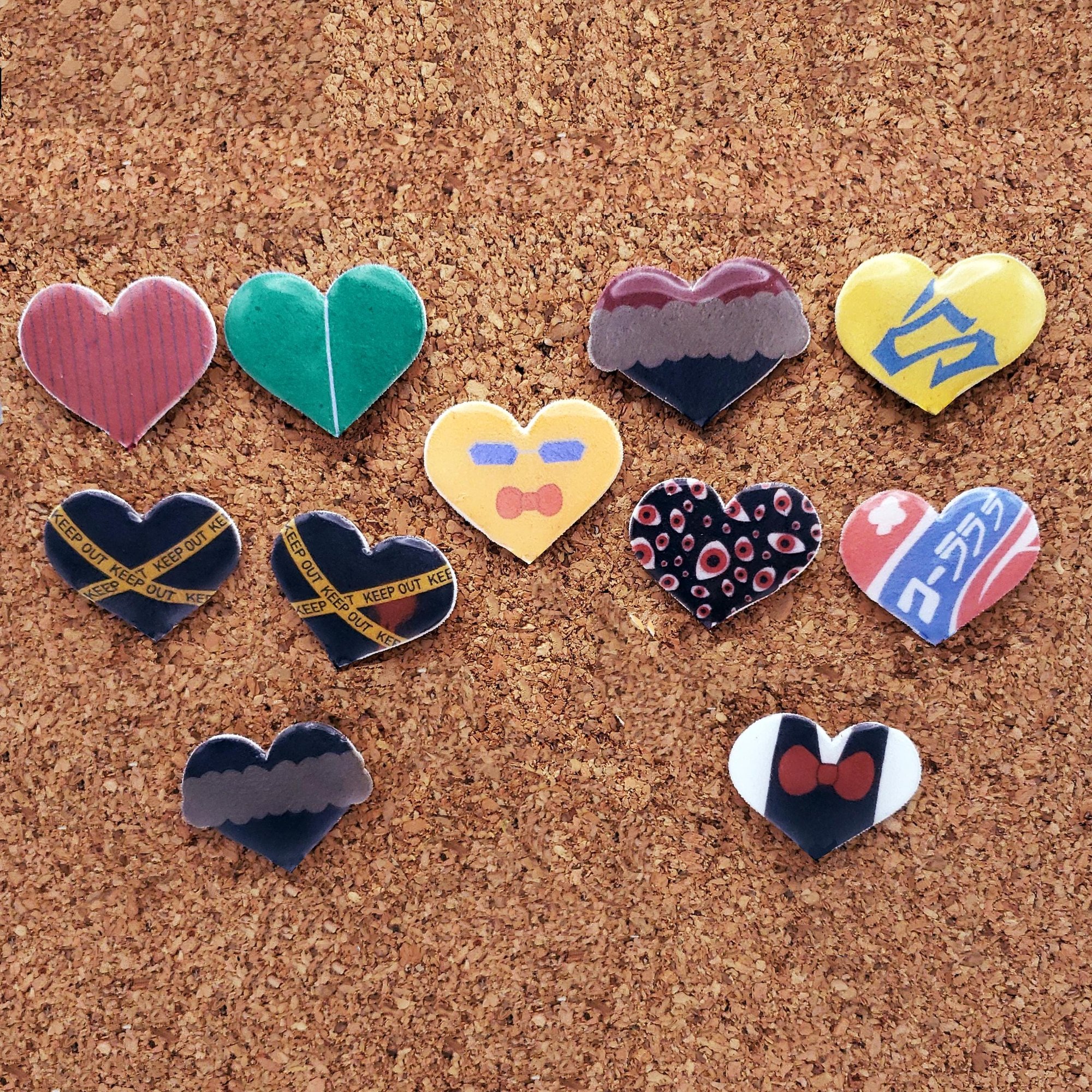 Durarara heart pins, meant to help fill in the space of themed bags or boards. Pins representing Chikage Rokujo, Kyohei Kadota, Izaya Orihara, Shizuo Heiwajima and Celty Sturluson, as well as other misc. Durarara themes.